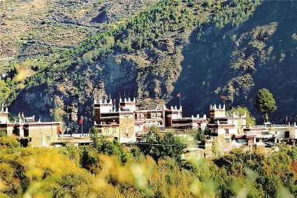 甲居藏寨依山面水,紅白相間的民居從大金河谷層層疊疊向上攀援,錯落有致的散布在山坡上,樹葉漸次褪綠,漸染紅色,山頂是皚皚白雪,將田園牧歌式的畫卷展示在人們眼前。
