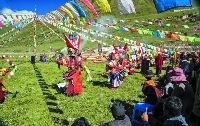 格薩爾王在藏族的傳說(shuō)里是神子推巴噶瓦的化身,一生戎馬,揚(yáng)善抑惡,宏揚(yáng)佛法,傳播文化,成為藏族人民引以為自豪的曠世英雄。這是筆者在格薩爾誕生地——德格阿須草原現(xiàn)場(chǎng)拍攝的一組照片,它呈現(xiàn)了康巴藏區(qū)送文化下鄉(xiāng),牧民如過(guò)節(jié)一樣歡樂(lè)的盛況。該組圖片為演出現(xiàn)場(chǎng)。