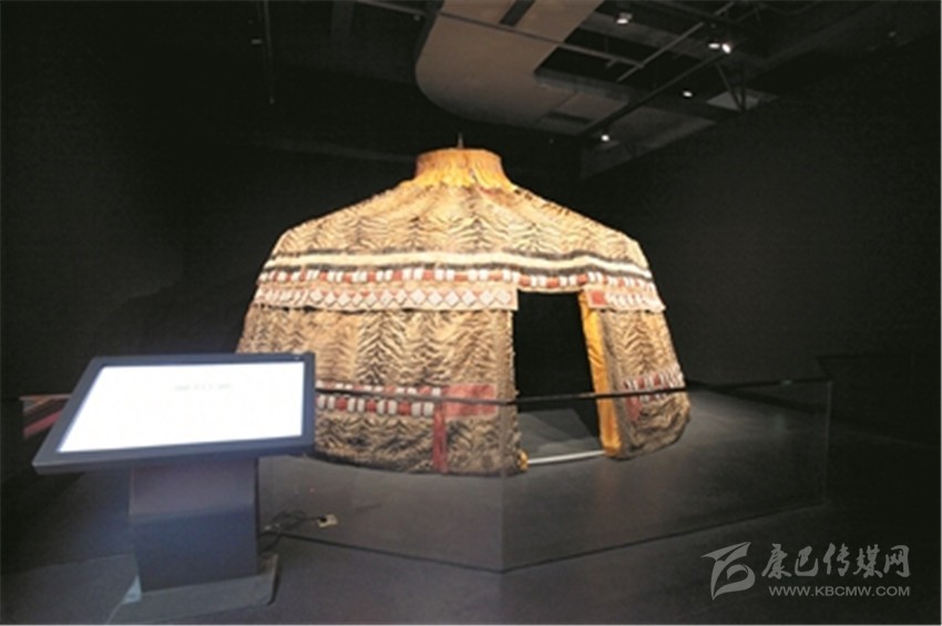 從體積上來說,“虎皮帳篷”確實(shí)是館藏文物當(dāng)中最大體量的一件物品。在眾多文物中,它的名聲在外。根據(jù)它的型制,人們測量虎皮圍度,訂制鋼架,四五個(gè)人同時(shí)搭建,才呈現(xiàn)出人們現(xiàn)在所看到的蒙古包樣式。這頂鑲海貝虎皮圓頂帳篷,共計(jì)108張虎皮。整體由二幅扇形帳頂,四幅近長方形帳圍,共六幅組成蒙古形式帳篷。其上點(diǎn)綴海貝作裝飾,帳主體為虎皮面料,間有豹皮、獺皮、駱駝皮等,有紅色粗棉布里襯。