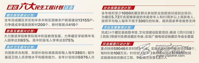 3月18日,四川省政府辦公廳印發(fā)《2015年藏區(qū)六大民生工程計(jì)劃總體工作方案》及藏區(qū)新居建設(shè)、教育發(fā)展振興、醫(yī)療衛(wèi)生提升、社會保障促進(jìn)、文化發(fā)展繁榮、扶貧解困行動等六個實(shí)施方案,預(yù)計(jì)各項(xiàng)民生資金總投入約52.66億元(含群眾投工投勞)。今年藏區(qū)“六大民生工程計(jì)劃”亮點(diǎn)紛呈,其中包括取消建設(shè)性項(xiàng)目州縣配套資金。
