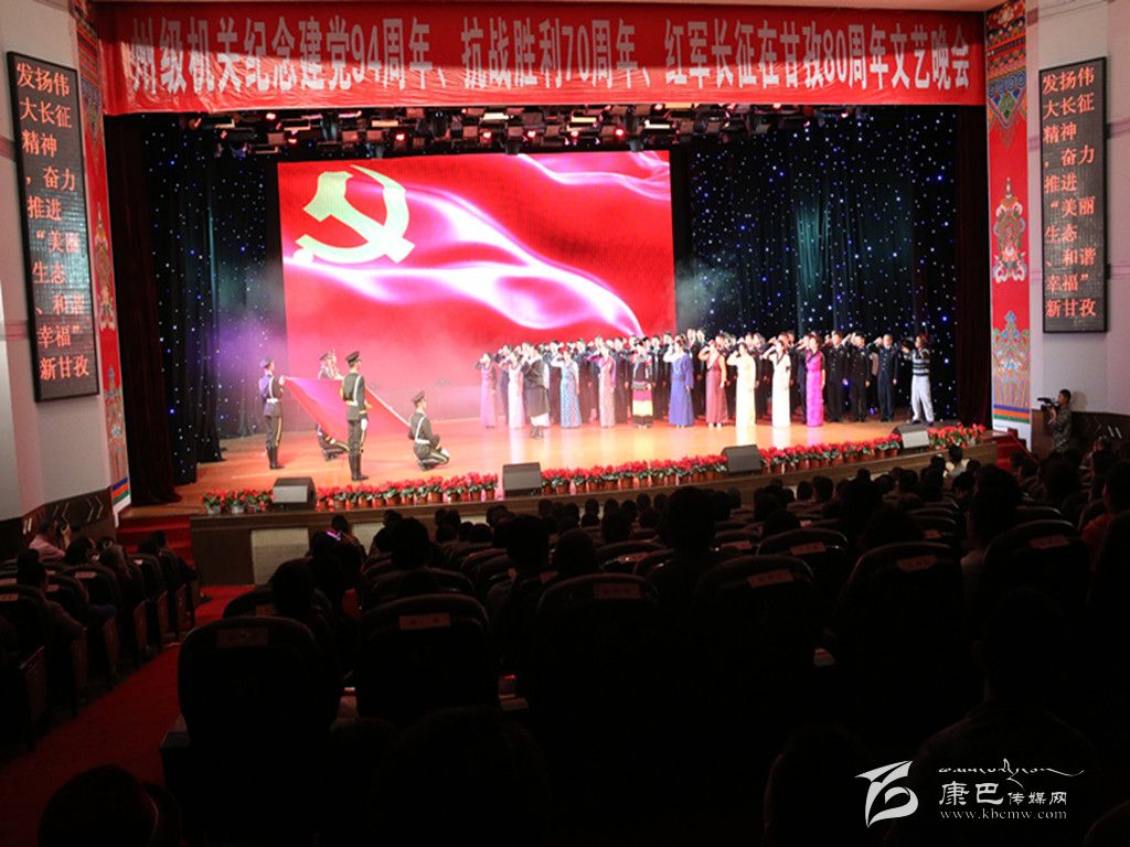 本網(wǎng)訊(記者 宋志勇 文/圖)6月30日晚,由州直屬機(jī)關(guān)工委和州民族干部學(xué)校聯(lián)合主辦的州級(jí)機(jī)關(guān)紀(jì)念建黨94周年、抗戰(zhàn)勝利70周年、紅軍長(zhǎng)征在甘孜80周年文藝晚會(huì)在康定劇場(chǎng)演出。州領(lǐng)導(dǎo)李康、相洛、白蘇英、何飚、周冬秀、蔣秀英、孫飛以及甘孜軍分區(qū)領(lǐng)導(dǎo)等觀看了演出。