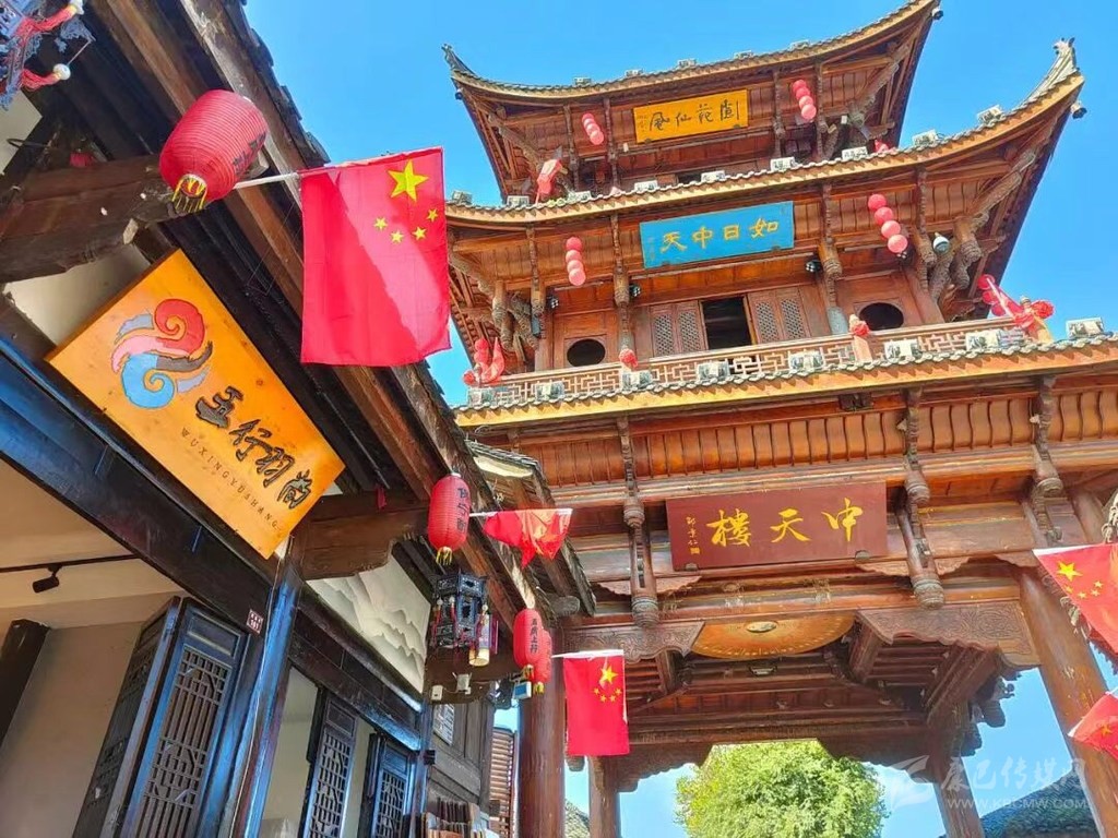 在南充古城閬中,以中天樓為核心鋪開的四條街道,全部被五星紅旗裝點開來,甚至部分街段上空鋪上了“紅旗?!?。新城的主干道,也掛上了一面面五星紅旗,站在街頭放眼望去,鮮艷的五星紅旗成為一道最靚麗的風(fēng)景線。