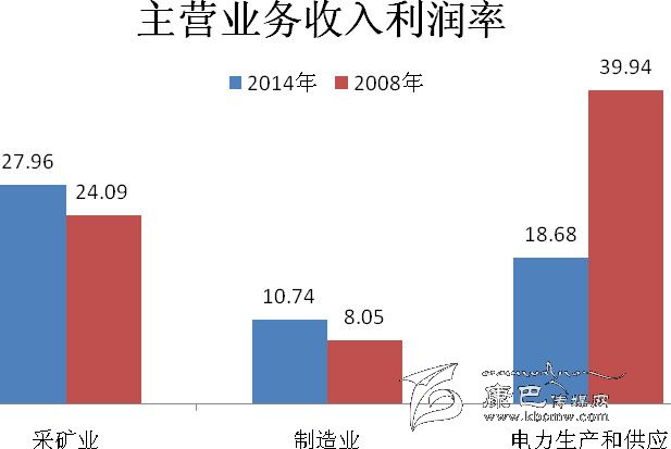 2013年,規(guī)模以上工業(yè)企業(yè)法人單位總資產(chǎn)貢獻(xiàn)率為8.46%,比2008年下降4.56個(gè)百分點(diǎn)。主營(yíng)業(yè)務(wù)收入利潤(rùn)率為18.83%,比2008年下降11.12個(gè)百分點(diǎn)。其中,采礦業(yè)為27.96%,比2008年上升3.87個(gè)百分點(diǎn);制造業(yè)為10.74%,比2008年上升2.69個(gè)百分點(diǎn);電力、熱力、燃?xì)饧八a(chǎn)和供應(yīng)業(yè)為18.68%,比2008年下降21.26 個(gè)百分點(diǎn)(詳見(jiàn)表2-4)。
