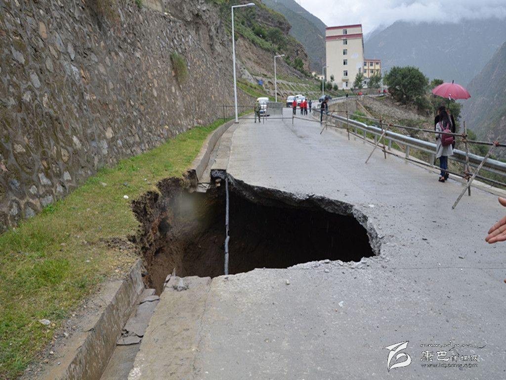 本網訊 (李麗瓊) 今日上午9時許,國電一名清潔工在清掃路面時發(fā)現,康定市孔玉鄉(xiāng)阿斗溝和寸達兩村的通村路面一段發(fā)生地陷并形成深坑。得知情況后,該鄉(xiāng)政府立即組織人員到現場查看險情。在現場,公路水泥路面下方的路基部分下陷形成了直徑約8、9米和不可預計高度的深坑。該鄉(xiāng)立即銜接猴子巖國電公司采取警示標牌、隔離帶的設立工作,同時與企業(yè)協商迅速開展排險工作。目前,當地政府已經介入處理,并已逐級上報相關部門。