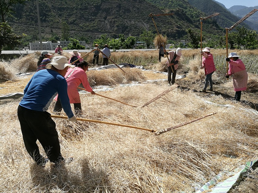 本網(wǎng)訊(尼胡克布 李娟 文/圖)5月12日,在瀘定縣德威鄉(xiāng)下河壩村農(nóng)田里,村民李永強(qiáng)正組織親戚朋友20余人,對自家3畝多油菜進(jìn)行搶收。村民們有的負(fù)責(zé)把一捆捆曬干的油菜抱到油布上,有的負(fù)責(zé)用農(nóng)具進(jìn)行打籽,現(xiàn)場一派繁忙的景象。