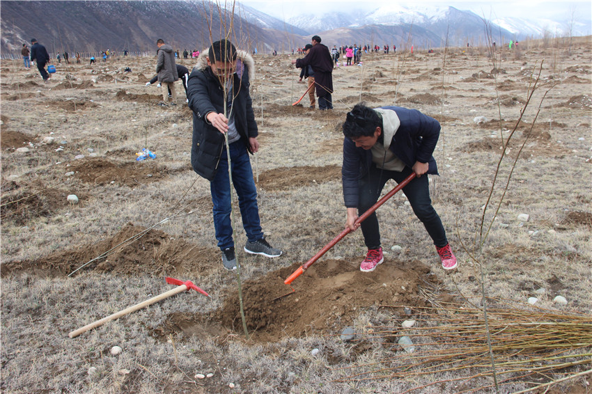當(dāng)天早上10時許,洛須鎮(zhèn)正科鄉(xiāng)曲德村的植樹現(xiàn)場一派熱火朝天的景象。參加植樹的人們,個個熱情洋溢、干勁十足。有的拿鐵鍬,有的提水桶,有的栽樹、蓋土……每一道工序都嚴(yán)格按要求進(jìn)行。兩個小時后,一排排樹苗整齊地佇立在藍(lán)天下,就像列隊整齊等待檢閱的士兵。