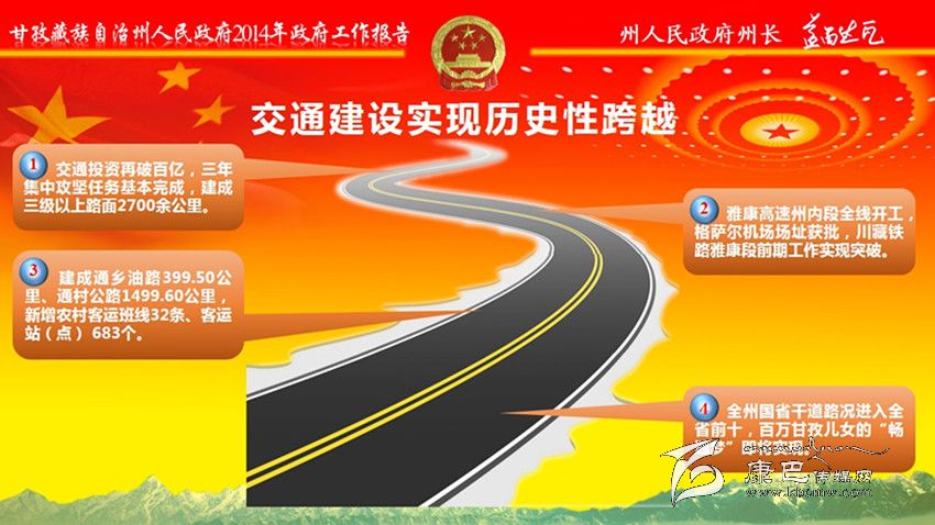 交通建設實現(xiàn)歷史性跨越。交通投資再破百億,建成三級以上路面2700余公里。雅康高速州內(nèi)段全線開工,格薩爾機場場址獲批,川藏鐵路雅康段前期工作實現(xiàn)突破。建成通鄉(xiāng)油路399.5公里、通村公路1499.6公里,新增農(nóng)村客運班線32條、客運站(點) 683個。全州國省干道路況進入全省前十。徹底告別無電鄉(xiāng)歷史。完成投資100億元,“電力天路”等項目順利實施,“川藏聯(lián)網(wǎng)” 工程提前半年建成投運;18個縣實現(xiàn)與主網(wǎng)連網(wǎng);“遠村點亮”全面完成。城鄉(xiāng)面貌煥然一新。堅持建好縣城,全州市政基礎設施有效提升。堅持做大集鎮(zhèn),改造小城鎮(zhèn)危舊房1118戶;投入1.34億元完善姑咱、馬尼干戈、香格里拉、八美4個省級“百鎮(zhèn)試點”鎮(zhèn)市政設施,13個鄉(xiāng)獲準撤鄉(xiāng)建鎮(zhèn)。堅持做美村寨,成功創(chuàng)建45個省級“美麗鄉(xiāng)村”示范村,19個州級幸福美麗新村試點建設全面啟動,打造新村聚居點235個,建成藏區(qū)新居1.11萬戶。全州城鎮(zhèn)化率達到27%。通信覆蓋越來越廣。完成投資4.53億元,國省干線和主要旅游景區(qū)通信網(wǎng)絡實現(xiàn)連續(xù)覆蓋。生態(tài)底色更加鮮明。編制完成《甘孜州生態(tài)文明建設規(guī)劃》,落實國家生態(tài)功能區(qū)轉(zhuǎn)移支付資金6.8億元,生態(tài)保護與建設工程加快推進,草原植被、森林覆蓋率分別達到78%、33.04%。