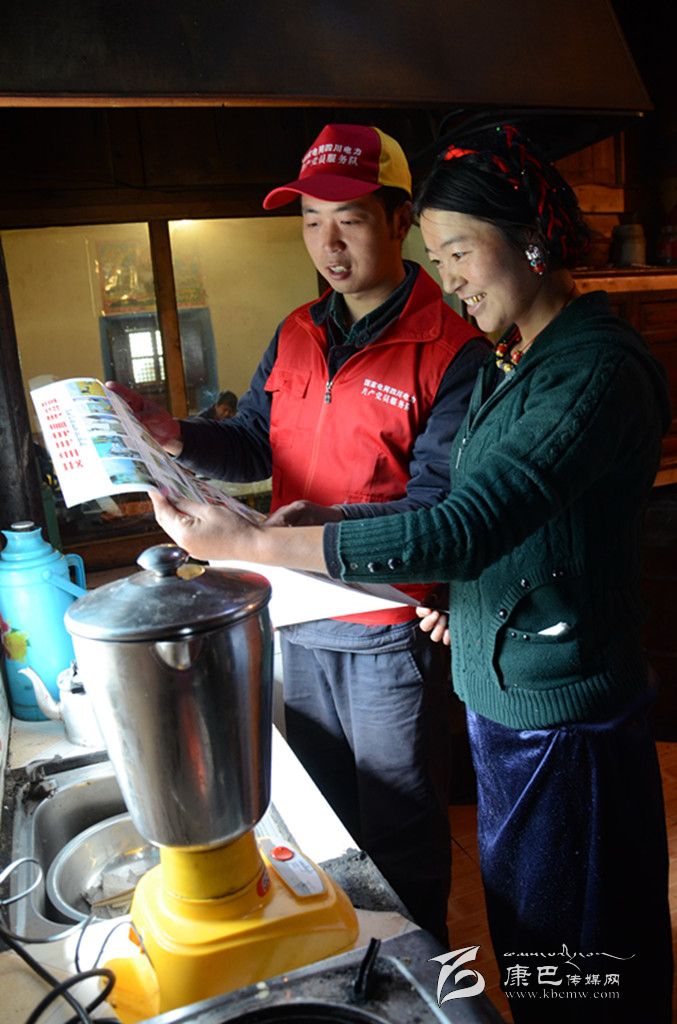 告別學(xué)校的同學(xué)們,新都橋供電所的工作人員又趕向下一個(gè)地點(diǎn)——瓦澤鄉(xiāng)營(yíng)官村。走進(jìn)一戶農(nóng)民的家里,女主人汪修卓瑪正在用打茶機(jī)制作酥油茶,打茶機(jī)旁的電爐上一個(gè)水壺正在咕嚕咕嚕地冒著熱氣。工作人員趕緊走上去關(guān)掉電爐,并告訴汪修卓瑪:“你們平時(shí)使用電爐等家用電器要注意安全,水特別容易導(dǎo)電,水開了要及時(shí)關(guān)掉電爐,使用打茶機(jī)時(shí)要先擦干外殼和底部的水……”