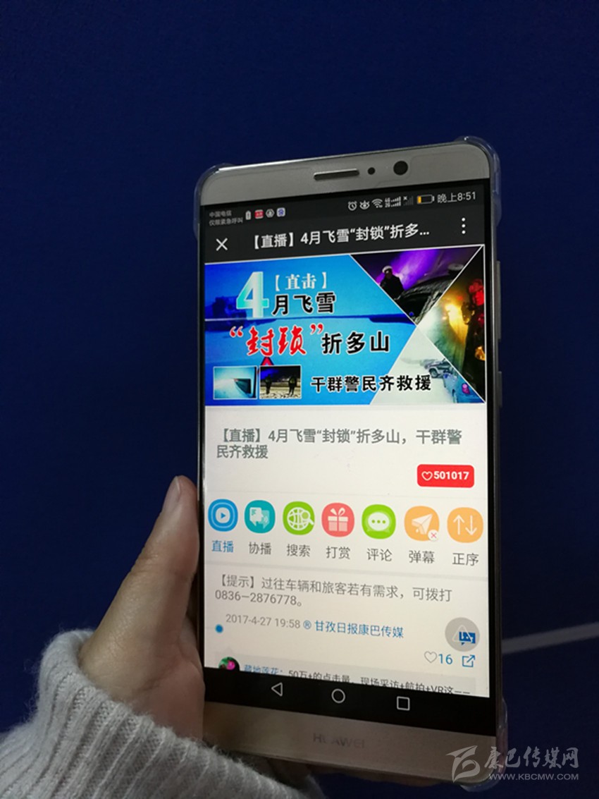 至下午1點(diǎn)20分,甘孜日報(bào)社對折多山大雪現(xiàn)場的立體交叉式直播已引來30萬的關(guān)注和轉(zhuǎn)發(fā)。新華社四川分社、華西都市報(bào)封面新聞、中國新聞網(wǎng)、網(wǎng)易新聞?lì)l道等州外媒體分別轉(zhuǎn)載、引用了甘孜日報(bào)社開展的相關(guān)報(bào)道。至下午5時(shí),直播平臺(tái)已發(fā)布幾十個(gè)采訪視頻、數(shù)百張圖片、近千條消息,吸引50多萬人點(diǎn)擊觀看。