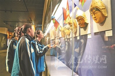 學(xué)生們?cè)诓┪镳^參觀面具展。