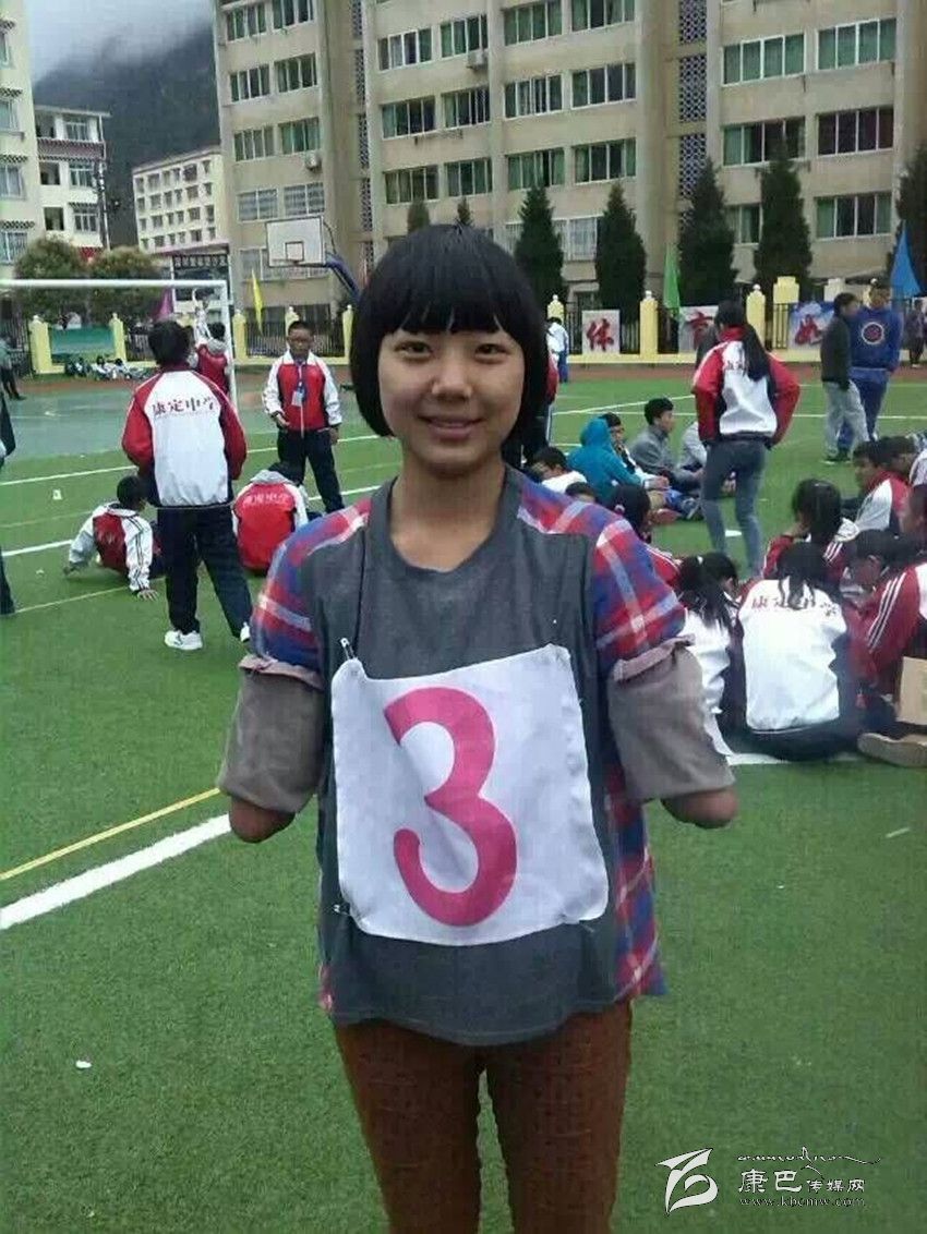 在康定中學校園里,你會邂逅這樣一位女孩:臉上永遠燦爛著陽光般的微笑,雙眼永遠閃爍著自信樂觀的光芒。教室里,她聚精會神地聽課;圖書館里,她專心致志地讀書;操場上,她身輕如燕地奔跑;寢室里,她開心爽朗地和同學交流??赡阕屑氁豢矗谷粵]有雙臂,就像折翼的天使。她就是該校高2016屆8班學生,羌族女孩許方燕。行走在高原的風中,她是一幀讓每一個人內(nèi)心泛起感動漣漪的美麗風景……